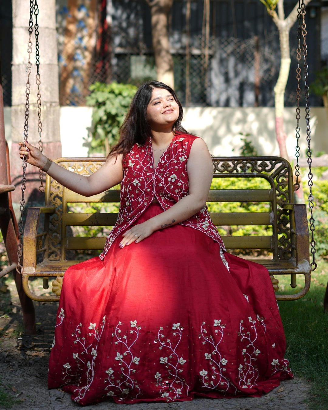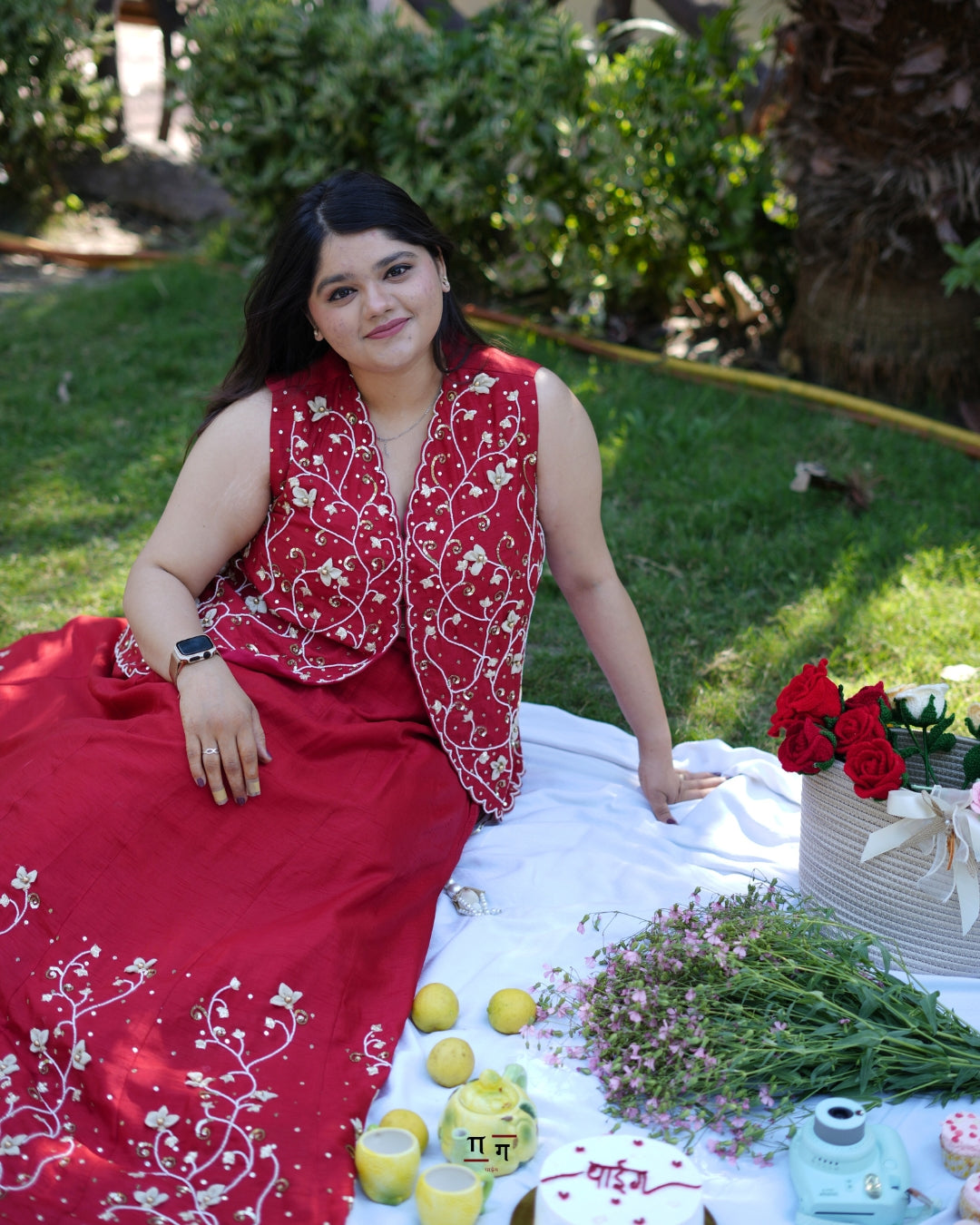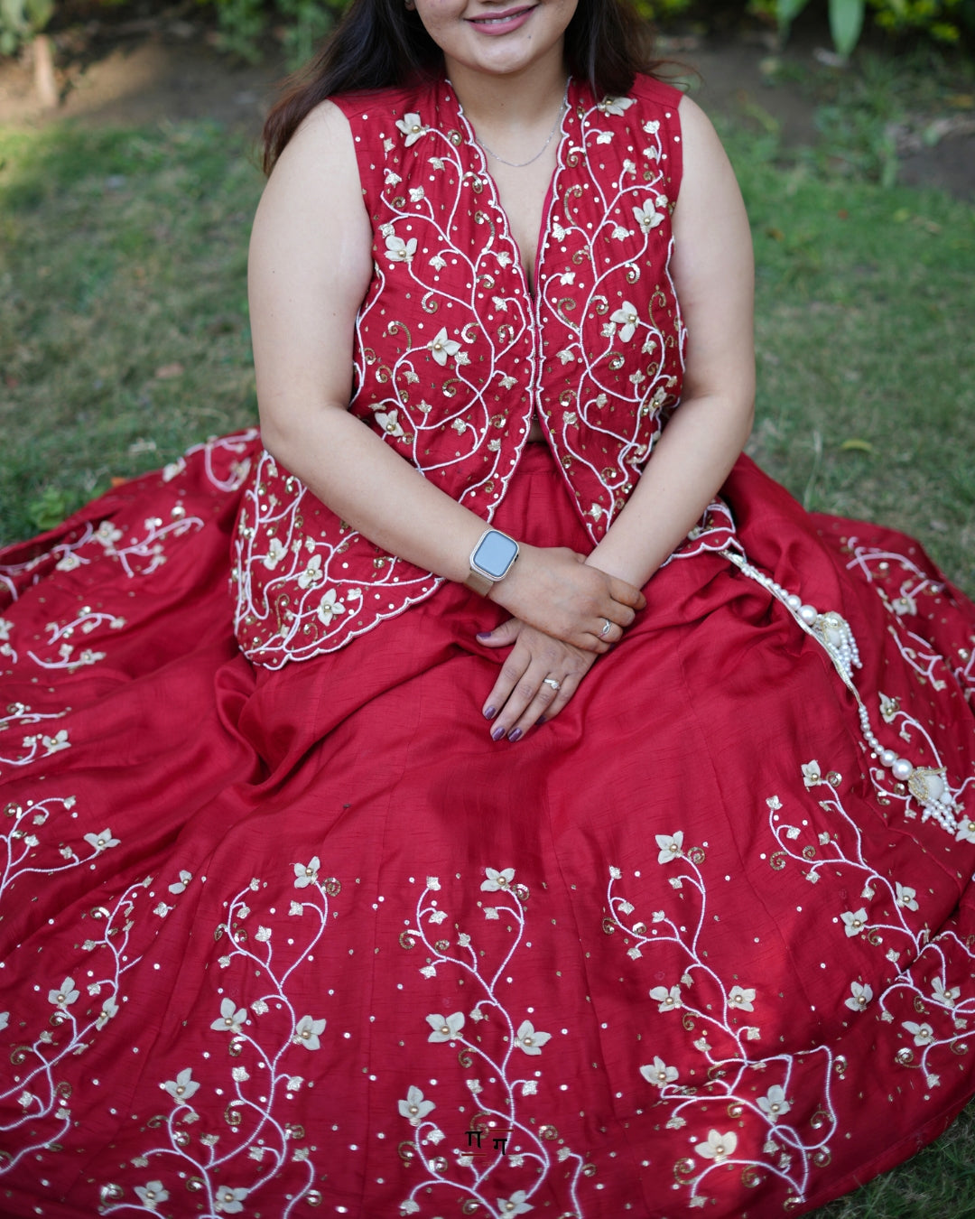 Crafted in rich silk, Red Radiance is a statement lehenga set adorned with intricate handwork and delicate handcrafted petals. The sleeveless vest-style blouse and fully embellished lehenga exude effortless grandeur, perfect for weddings and intimate celebrations.