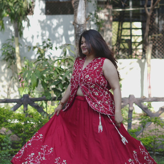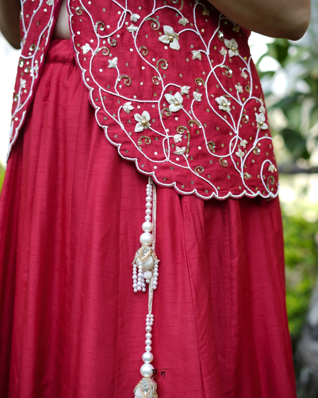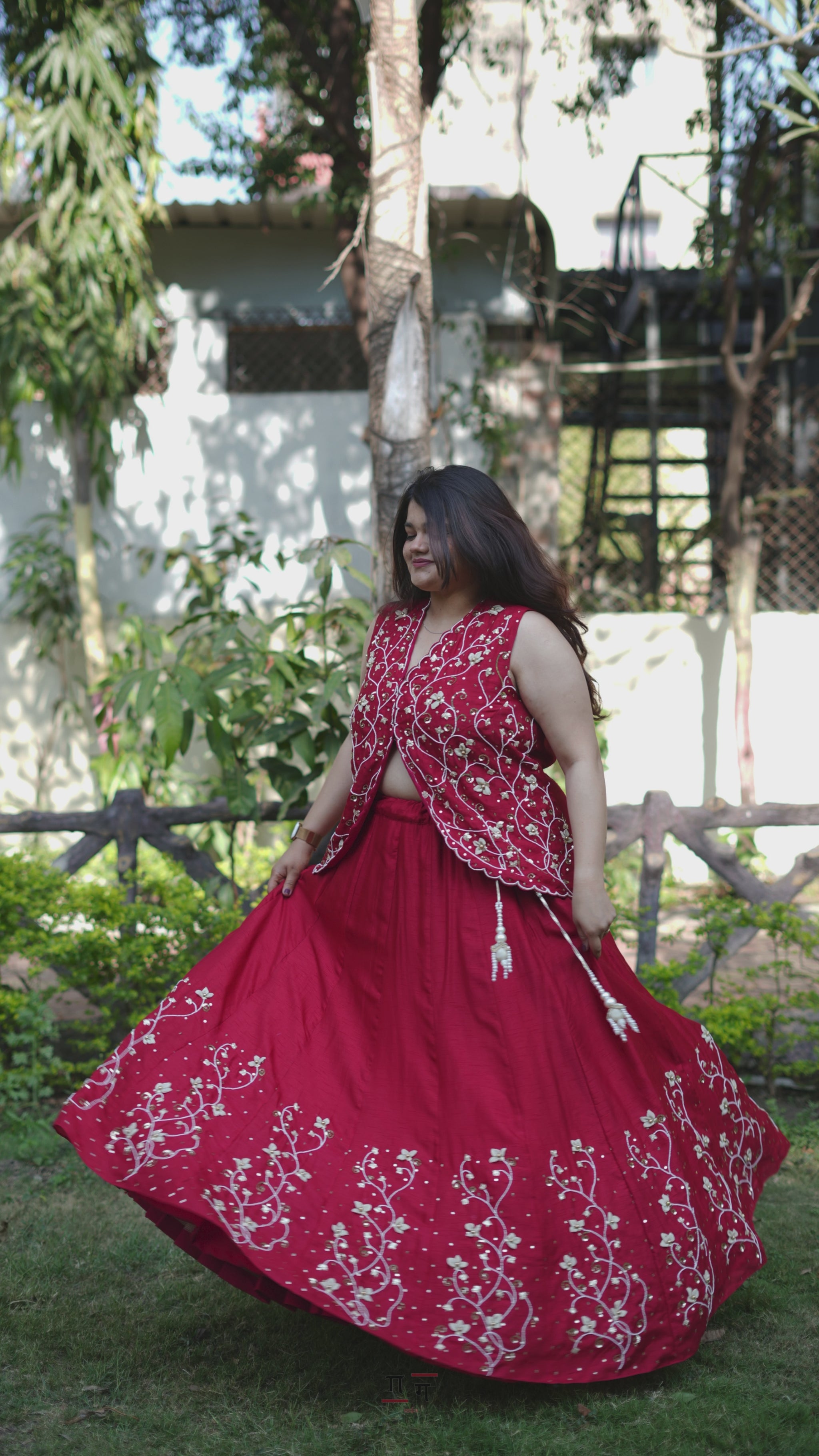Crafted in rich silk, Red Radiance is a statement lehenga set adorned with intricate handwork and delicate handcrafted petals. The sleeveless vest-style blouse and fully embellished lehenga exude effortless grandeur, perfect for weddings and intimate celebrations.